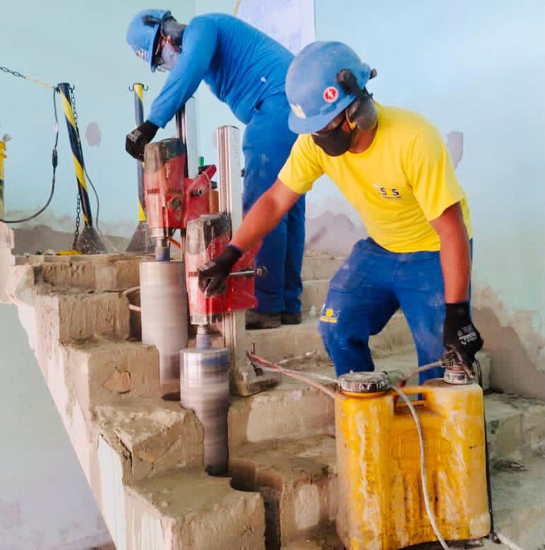 diferentes tipos de serviços, como: furos em lajes, furos em vigas, furos em piscinas de